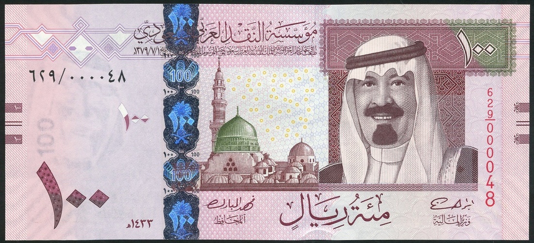 (x) Saudi Arabian Monetary Agency, 1, 5, 10, 50 and 100 riyals, 2009-2012, all with serial number 000048, various prefixes, multicoloured, all with King Abdullah at right, value at low left