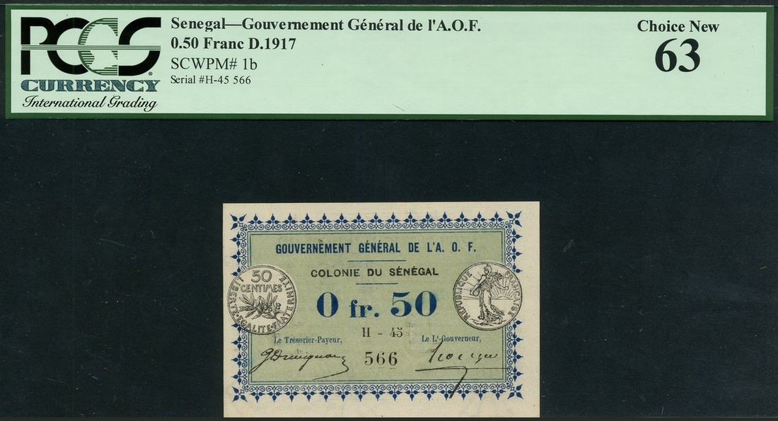 Afrique Occidentale Francaise, Senegal, 50 centimes, ND (1917 emergency issue), serial number 566, blue and pale green, 50 centimes coin in field, Duvigneau and Leveque signatures, reverse text