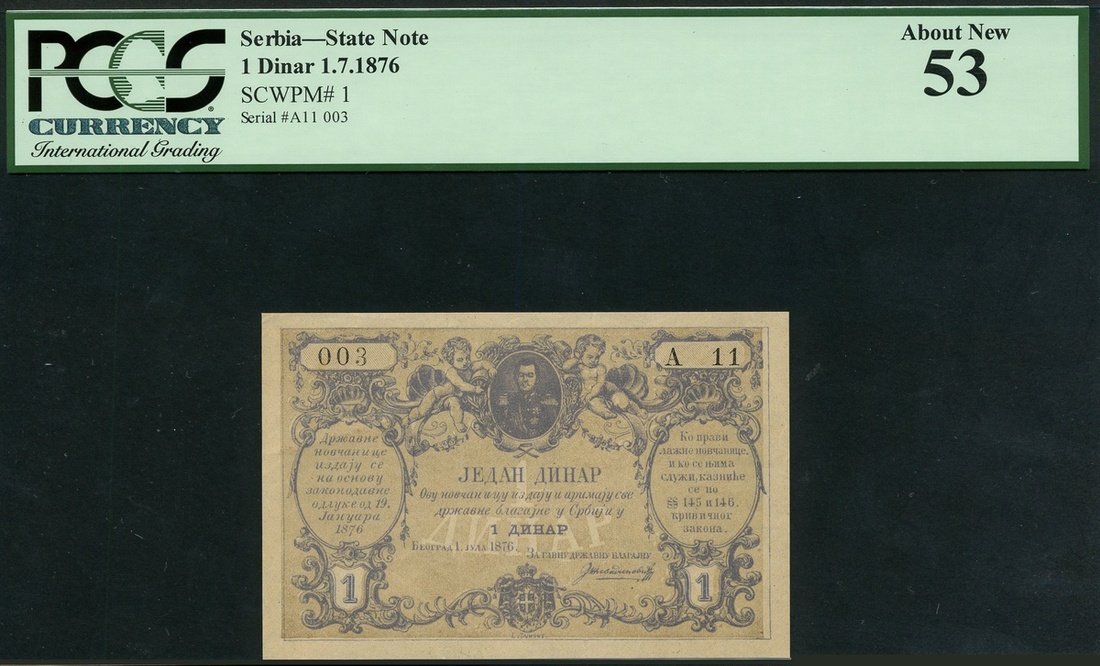 State notes of the Kingdom of Serbia, 1 dinar, 1 July 1876, serial number A 11-003, .11-003 blue & grey-green, Prince Milan top centre, cherub at top left and right, arms low centre, engraved by L. Dumont of Paris