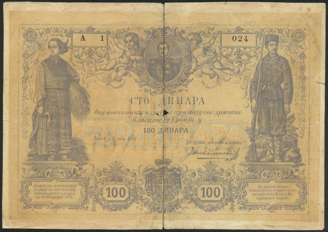State notes of the Kingdom of Serbia, 100 dinara, 1 July 1876, serial number A1-024 blue & old cream, Prince Milan top centre, allegorical figure at left and right, arms low centre, reverse Milos Obrenovic with crowd, double headed eagle top centre