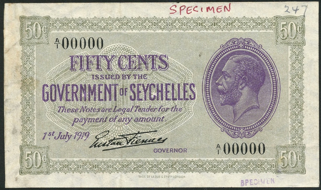 (†) Government of Seychelles, specimen 50 cents, 1 July 1919, serial number A/1 00000, uniface, purple on grey-green, George V at right, value at corners, Twistleton-Wykeham-Fiennes signature