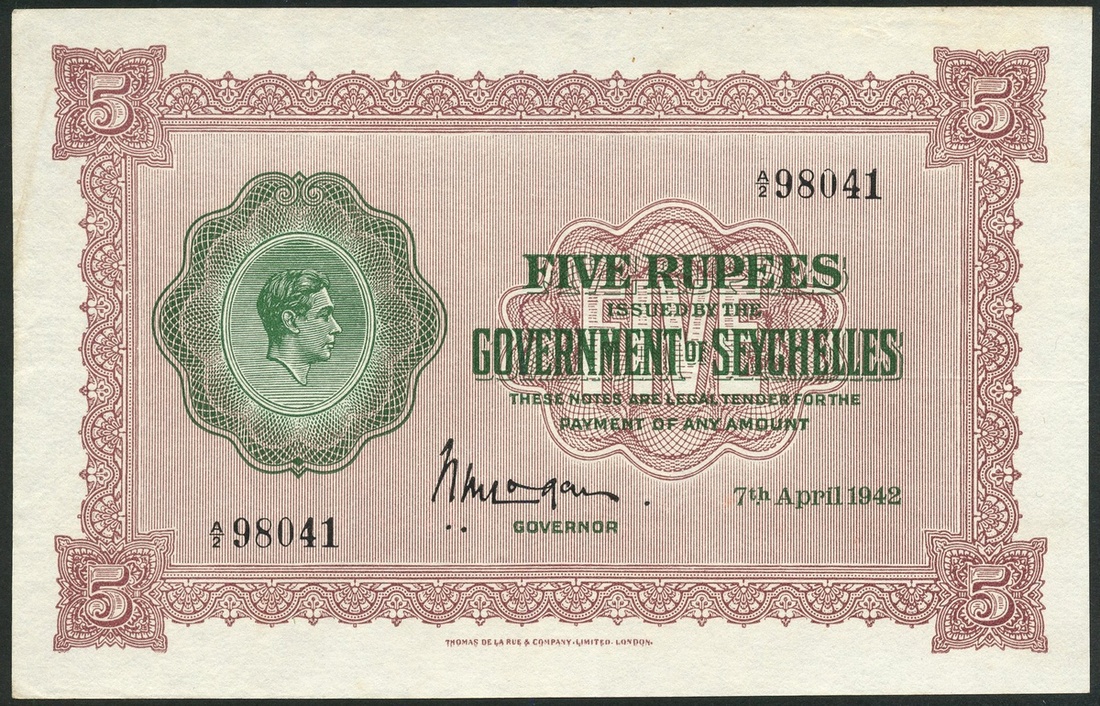 (x) Government of Seychelles, 5 rupees, 7 April 1942, serial number A/2 98041, uniface, green on pink underprint, George VI at left, value at right and each corner, Logan signature