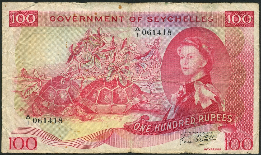 Government of Seychelles, 100 rupees, 1 August 1973, serial number A/1 061418, red on multicolour underprint, Elizabeth II at right, two tortoises at left, value at low right and each corner