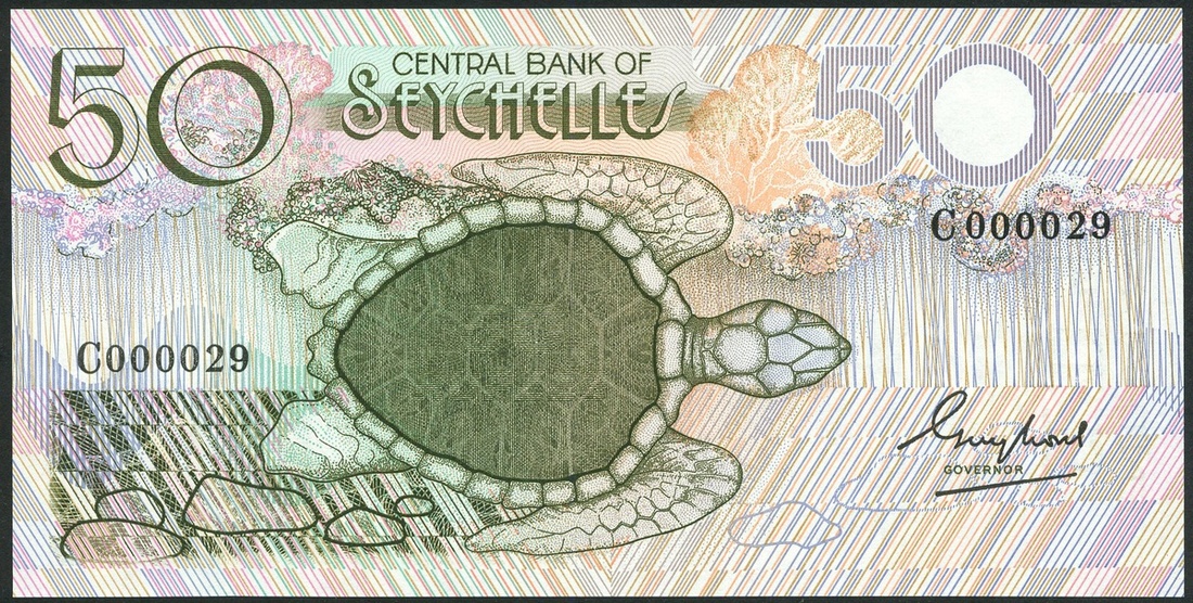 Seychelles Monetary Authority, 50 rupees (2), ND (1980), serial number A 000049, green and multicoloured, turtle at centre, Chetty signature, Central Bank of the Seychelles, 50 rupees, ND (1983), serial number C 000029, colour and design as previous