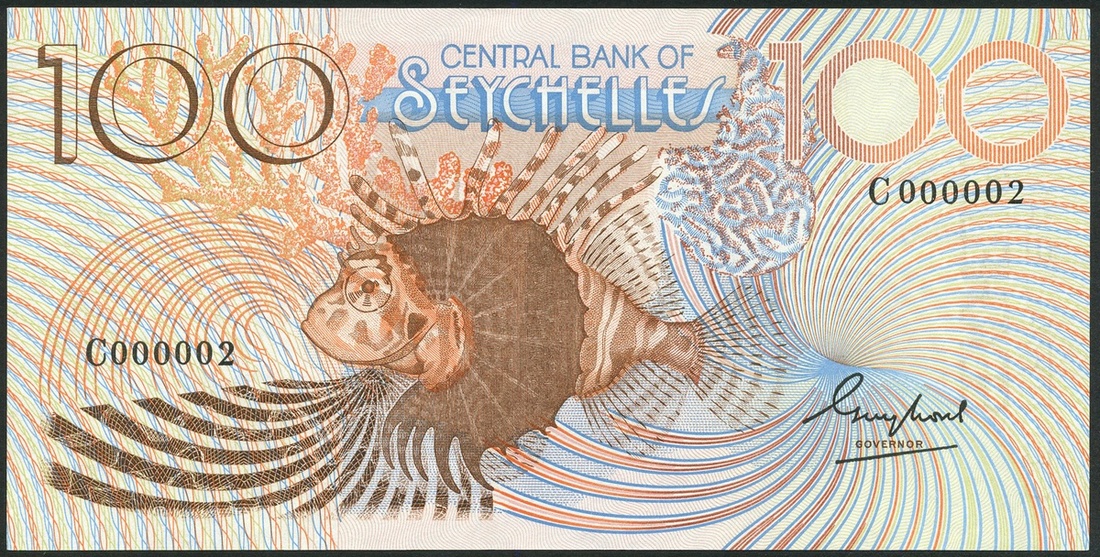 Central Bank of Seychelles, 100 rupees (2), ND (1980), serial number C 000002, 000003, brown and pale blue, lion fish at centre, Chetty signature
