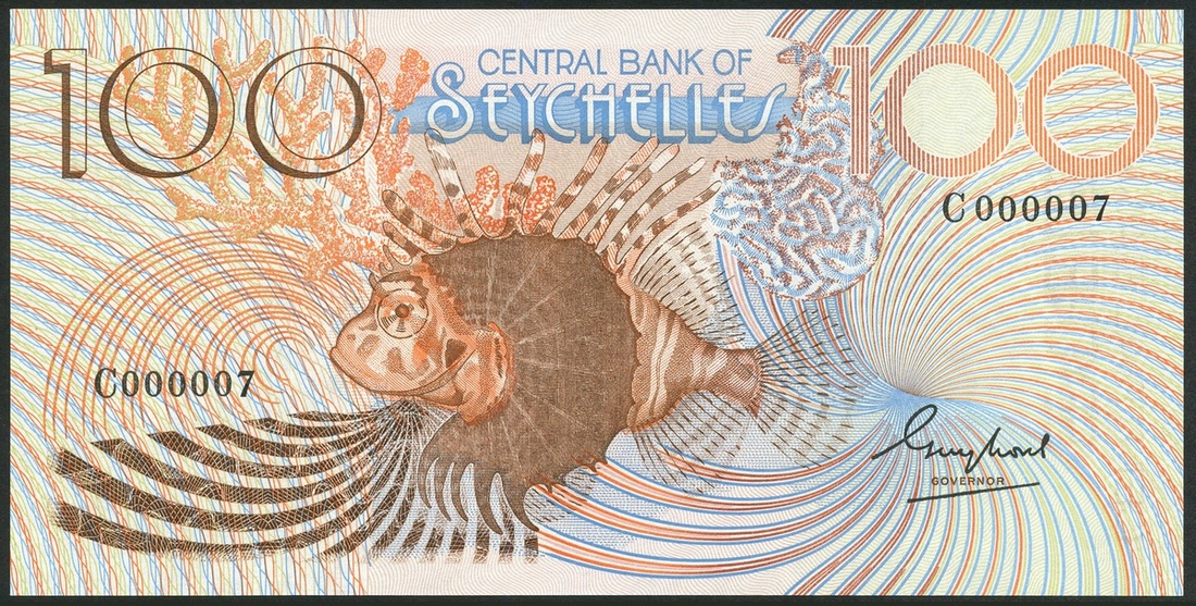 Central Bank of Seychelles, 100 rupees, ND (1980), serial number C 000007, brown and pale blue, lion fish at centre, Chetty signature