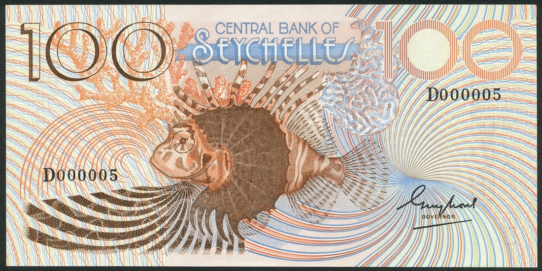 (x) Central Bank of Seychelles, 100 rupees, ND (1983), serial number D 000005, brown and pale blue, lion fish at centre, Morel signature
