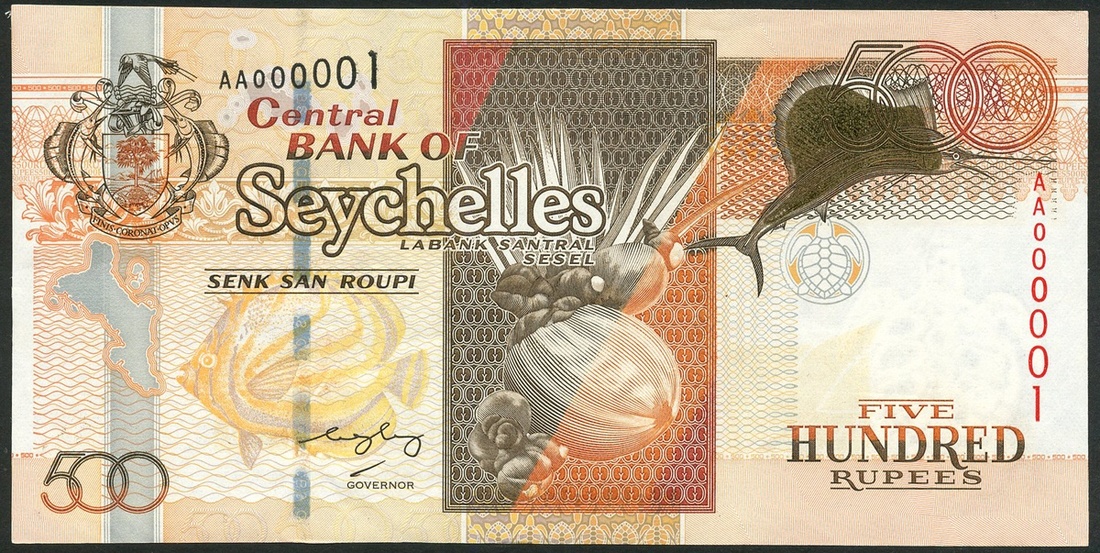 Central Bank of Seychelles, 500 rupees, ND (2005), serial number AA 000001, pink and brown, sailfish top right, arms top left, Chang-Leng signature