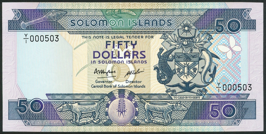 (x) Solomon Islands, a set of replacement notes from the 1986 issue comprising $2, serial number Y/1 002869, green, $5, serial number Y/1 006363, blue, $10, serial number Y/1 006004, pink, $20, serial number Y/1 017543, brown and orange, $50, serial number Y/1 000503, teal, purple and blue, all with coat of arms at right