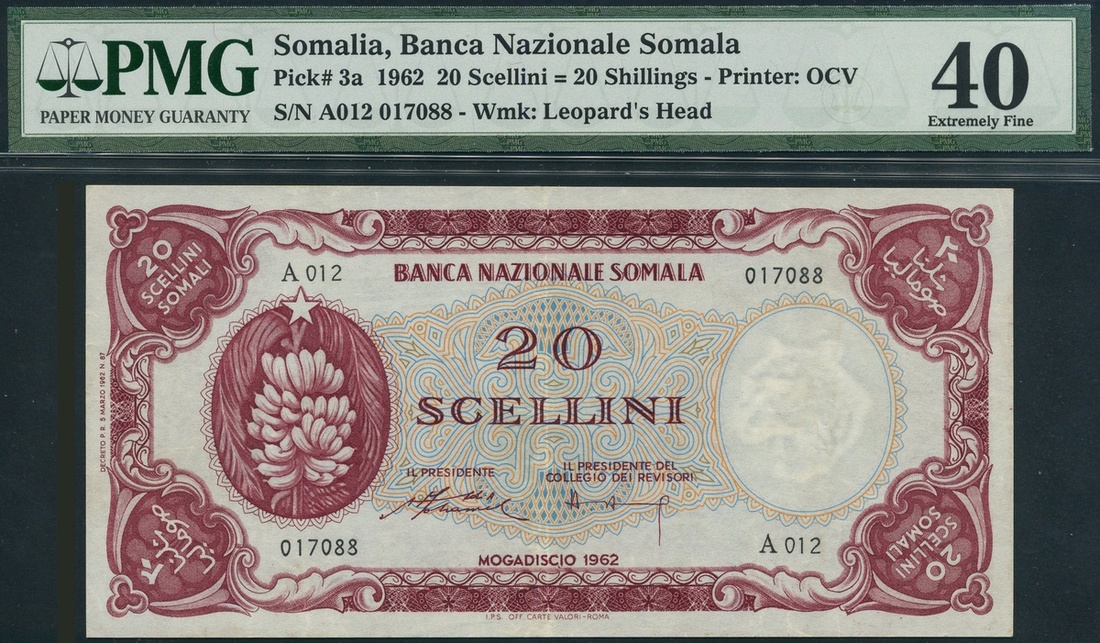 Banca Nazionale Somala, 20 scellini (2), 1962, 1971, prefixes A and B, purple-brown, bananas at left, also 100 scellini (2), 1962, 1971, prefixes A and B, blue, artefacts at left