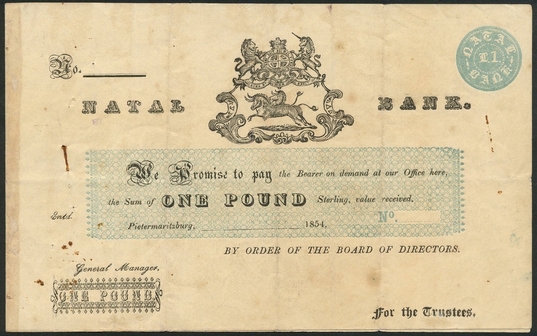 Natal Bank, South Africa, an uncut pair of unissued £1, Pietermaritzburg, 1854, black and white with a pale blue central panel, arms top centre, value in pale blue circular frame top left