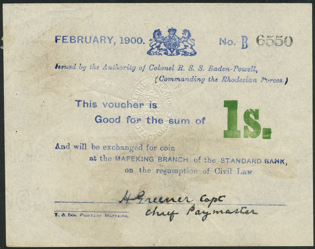 Siege of Mafeking, South Africa, 1 shilling (2), January 1900, serial number B 6550 and B 7476, blue text on white paper, arms top centre, value in green at right, embossed seal of the Bechuanaland Protectorate at centre, facsimile signature in blue of Capt.H.Greener, the Chief paymaster, low right