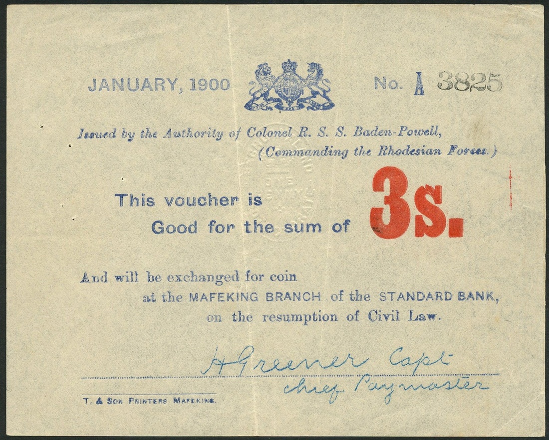 Siege of Mafeking, South Africa, 3 shillings, January 1900, serial number A 3825, blue text on white paper, arms top centre, value in red at right, embossed seal of the Bechuanaland Protectorate at centre, facsimile signature in blue of Capt.H.Greener, the Chief paymaster, low right