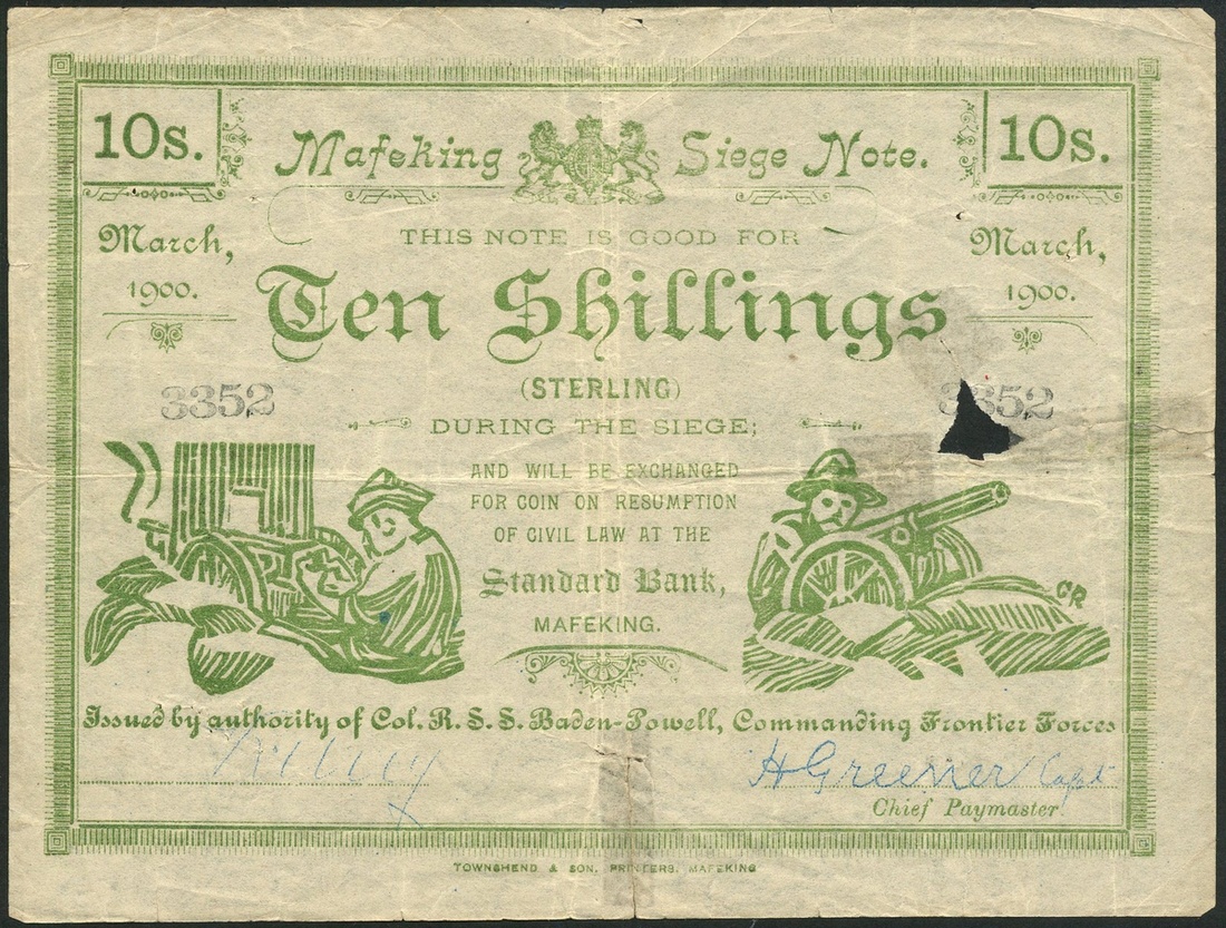 Siege of Mafeking, South Africa, 10 shillings (3), March 1900, serial number 2967, 3352, 6889, green text on white paper, arms top centre, value at centre and top left and right, soldier with maxim gun low left, soldier with Nordenfelt field gun low right, seal of the Bechuanaland Protectorate at centre, facsimile signature in blue of Mr R.Urry, the Manager of the local branch of the Standard Bank low left, Capt.H.Greener, the Chief paymaster, low right