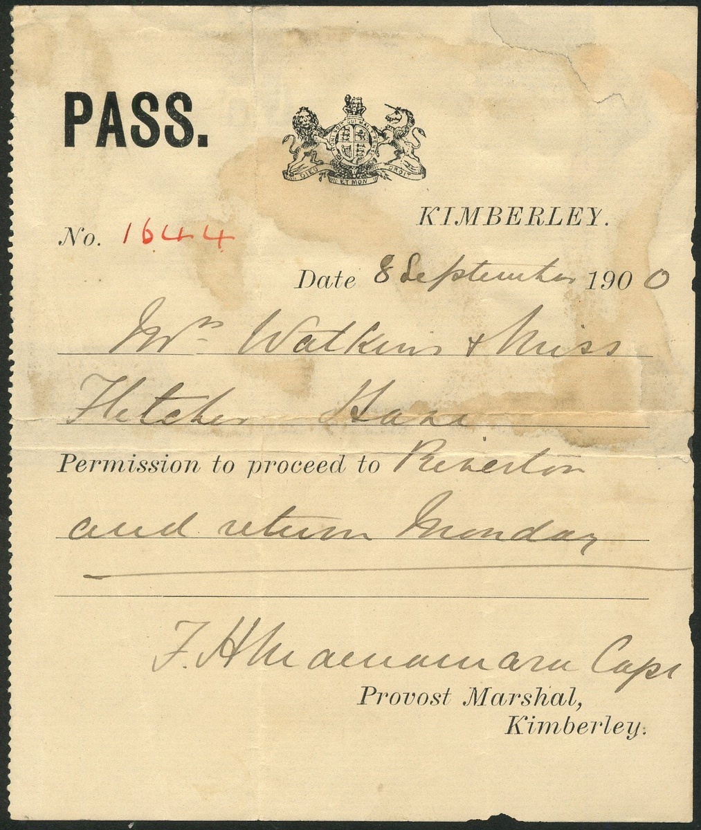 Boer War ephemera, South Africa, a Road Traffic pass dated 21.4.01, an unissued order for milk for Schmidts Stores, Market Sq., a pass dated Kimberley, 8 September 1900 and a permit to have arms in possession dated Kimberley 9/10/01 and signed by the Provost Marshall, also two souvenir sheets issued by the Bank of New South Wales to commemorate the relief of the siege of Mafeking