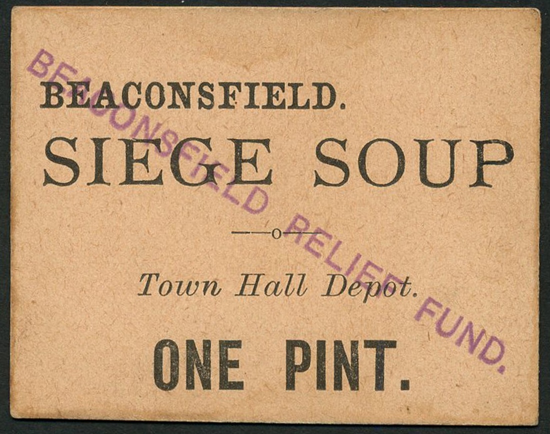 Siege of Kimberley, Suburb of Beaconsfield, South Africa, siege soup ticket for one pint at the Town Hall depot, ND (1899-1900), no serial number, type 1, black text on beige card, purple diagonal handstamp 'BEACONSFIELD RELIEF FUND'