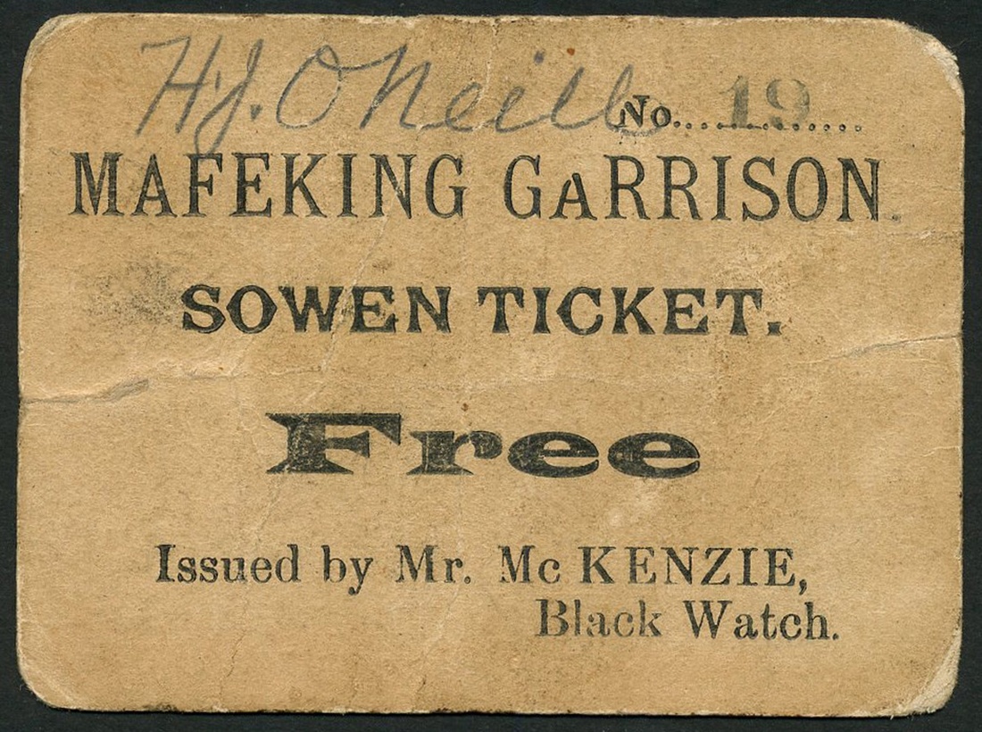 Siege of Mafeking, South Africa, sowen ticket, ND (March 1900-), serial number 19, black text 'MAFEKING GARRISON SOWEN TICKET FREE' on pale tan card, text low centre reads 'Issued by Mr McKenzie, Black Watch', manuscript H.J.O'Neill top left