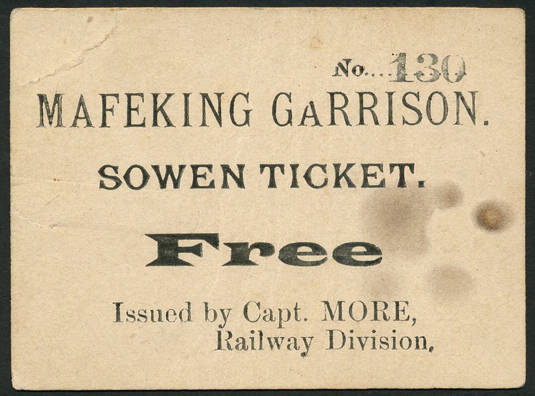 Siege of Mafeking, South Africa, sowen ticket, ND (March 1900-), serial number 130, black text 'MAFEKING GARRISON SOWEN TICKET FREE' on pale tan card, text low centre reads 'Issued by Capt.More, Railway Division'