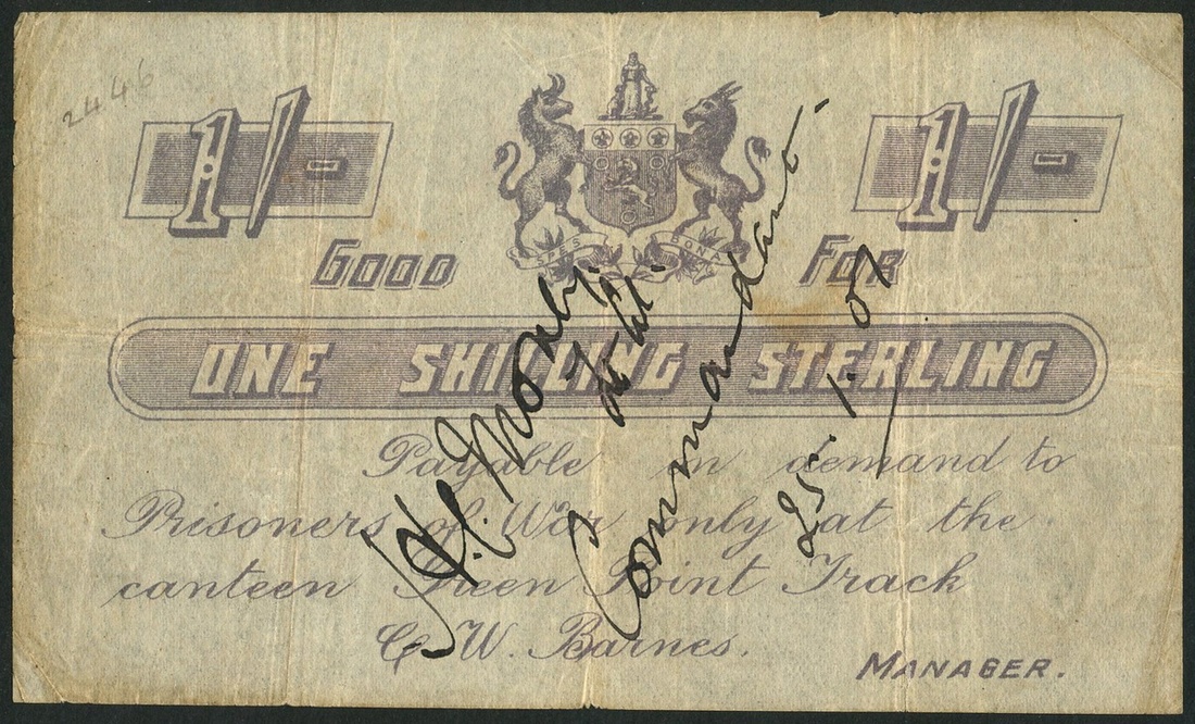 Green Point Track, Cape Town, 1 shilling, second series, 21 July 1900, serial number 1691, pale violet text on white paper, arms of Van Riebeeck, founder of the Cape Colony top centre, value in rectangle top left and right and in long panel at centre, printed C.W.Barnes, Manager low centre, manuscript 'J.H.Money Lt.Col. Commandant 25.1.01' across face of note, also an unissued 1 shilling, 2 shillings and 5 shillings
