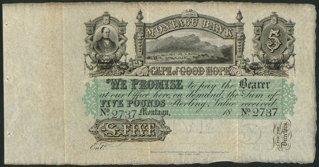 Montagu Bank, Cape of Good Hope, a part issued 5 pounds, Montagu, 18- (1861-1862), serial number 0551 and 2737, black and white with a green central panel, Montagu top left, town and mountains top centre, also Barry and Nephews unissued £5 (2), Swellendam, 185-, black and white, wagon and ox span at top centre