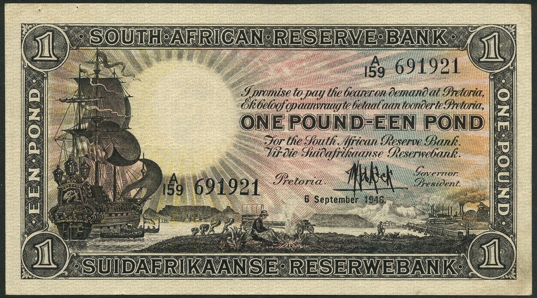 (x) South African Reserve Bank, 10 shillings (3), 1945, 1950 and 1955, and £1 (2), 1946 and 1947, red-brown and black respectively, first 10 shilling with values, others with van Riebeeck at left, £1s with galleon at left