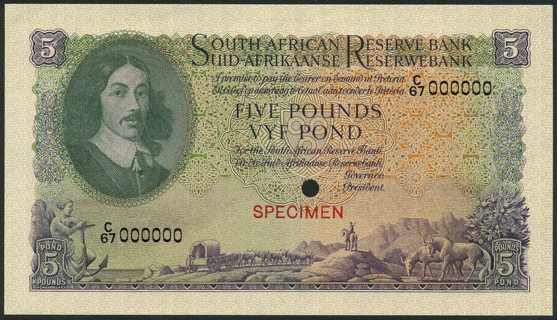 (†) South African Reserve Bank, colour trial £1, ND (1948), green and multicoloured, Van Riebeeck at left, galleons at right, reverse green, lion at centre, also colour trial £5, ND (1950), violet and multicoloured, also colour trial 2 rand, ND (1961), brown and pale blue, both Van Riebeeck at left