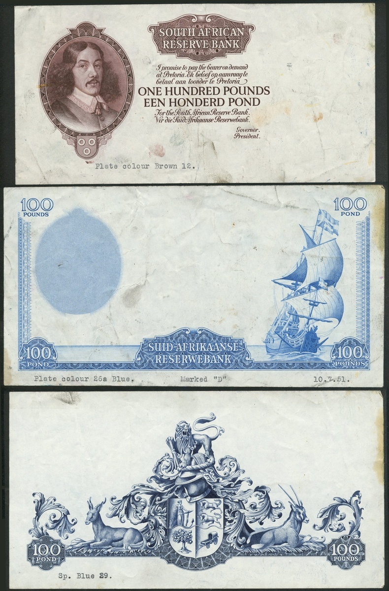 South African Reserve Bank, obverse (3) and reverse (1) die proofs for £100, ND (1952), comprising partial obverse, brown, Van Riebeeck at left, two identical partial obverse, blue, galleon at right, value at corners, and reverse, dark blue, arms and antelopes at centre