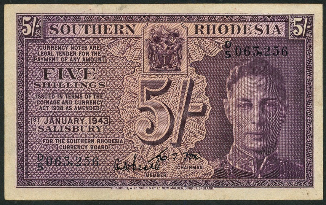 (x) Southern Rhodesia Currency Board, 5 shillings, 1 January 1943, serial number D/5 063256, purple, George VI at right, arms at top centre