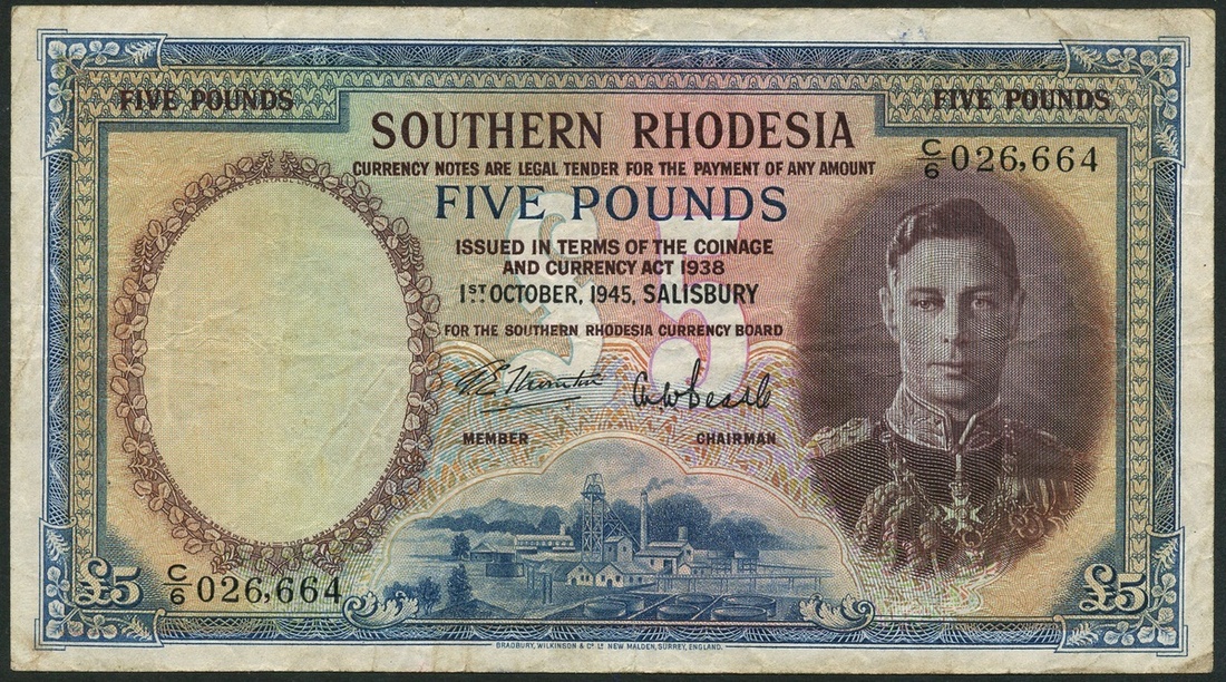 Southern Rhodesia Currency Board, 5 shillings (2), 1943, 1945, prefixes D/1 and D/34, purple, George VI at right, arms top centre, 10 shillings, 1 September 1951, prefix A/125, red-brown, £1, 1 January 1948, prefix B/77, green and £5, 1 October 1945, prefix C/6, blue, Bessle signature