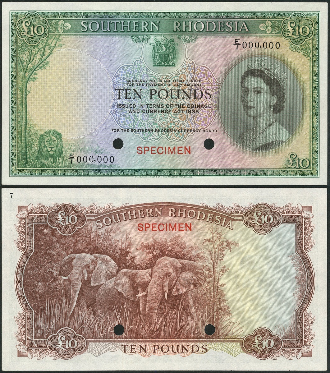 Southern Rhodesia Currency Board, colour trial £10, ND (1953), serial number E/1 000000, green on multicolour underprint, Elizabeth II at right, Lion at low left, arms at top centre, reverse brown, elephants at centre, red SPECIMEN overprint and two cancellation holes