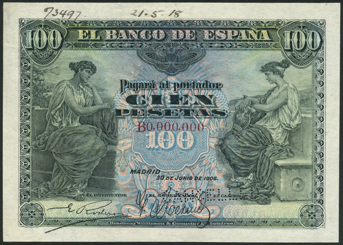 (†) El Banco de Espana, printer's archival specimen 100 Pesetas, 30 June 1906, serial number run in red B 1000001-B 9000000 on reverse, black, blue and multicoloured, seated maidens at left and right, reverse, blue and yellow, crowned arms of Spain at centre, value in ornate guilloches at left and right