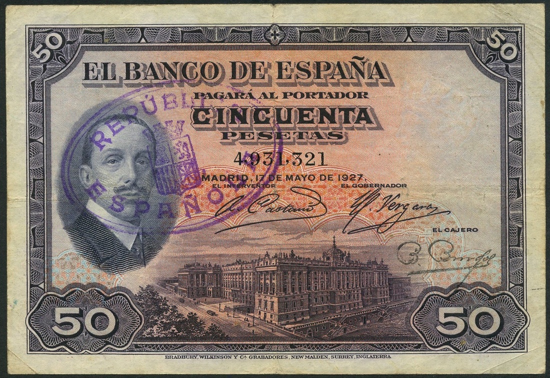 El Banco de Espana, 50 pesetas, 17 May 1927 (1931), serial number 4931321, purple on multicolour underprint, King Alfonso XIII at left, Royal palace in Madrid at low centre, purple Republic Validation at upper left corner