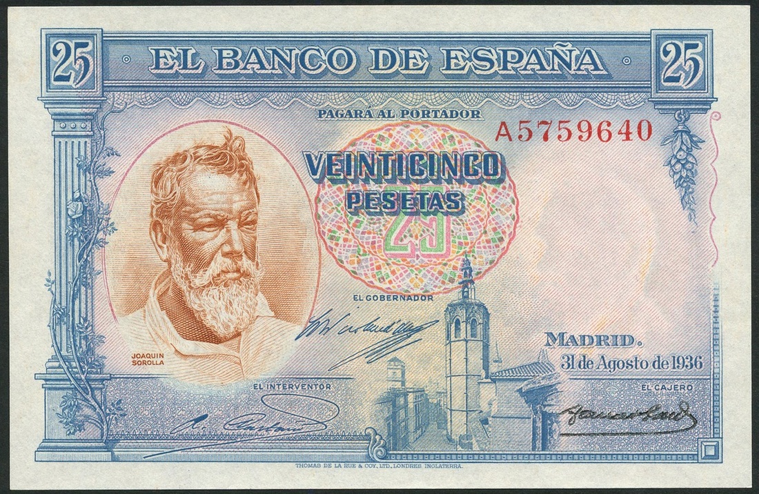 (x) El Banco de Espana, 25 pesetas, 31 August 1936, serial number A5759640, blue and brown on multicolour underprint, Joaquin Sorolla at left