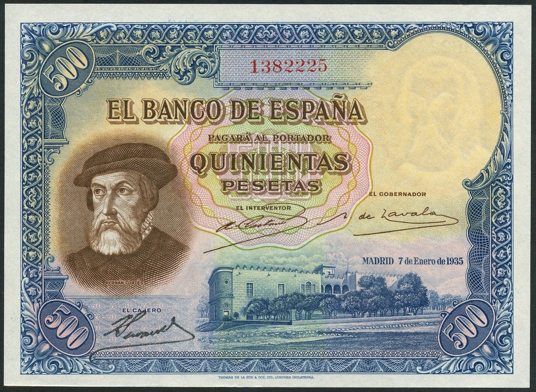 El Banco de Espana, 500 pesetas, 7 January 1935, serial number 1382225, blue on multicolour underprint, portrait Hernan Cortez at left, palace low right, value in green and pink tablet at centre, ornate border, reverse, bank title top centre, depiction of Cortez with troops and Mexican tribe, column at left and right