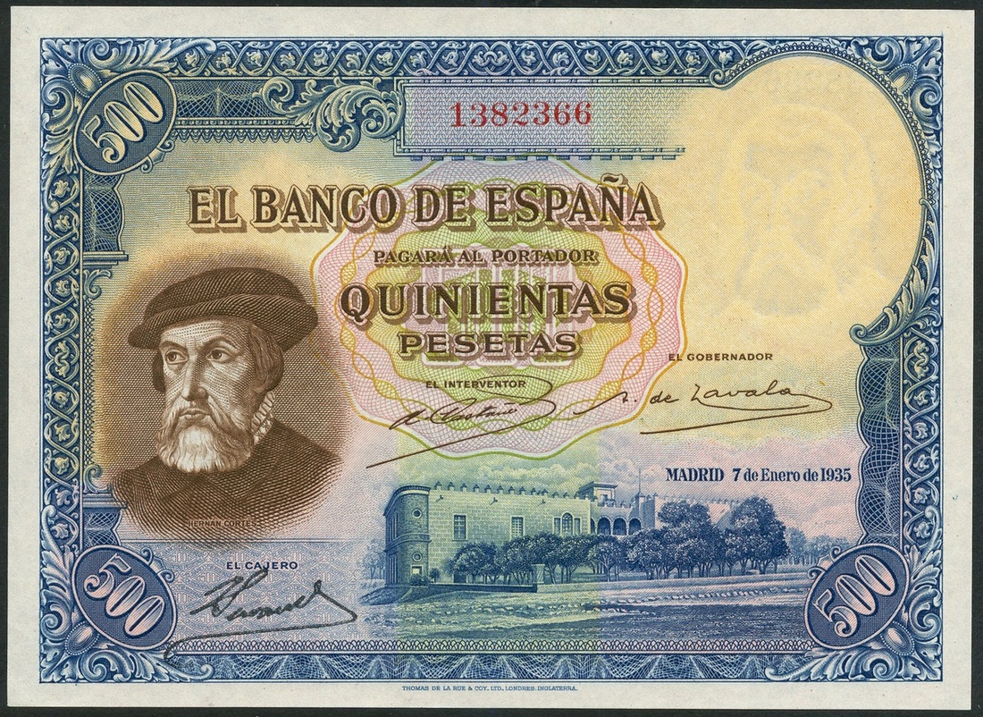 El Banco de Espana, 500 pesetas, 7 January 1935, serial number 1382366, blue on multicolour underprint, portrait Hernan Cortez at left, palace low right, value in green and pink tablet at centre, ornate border, reverse, bank title top centre, depiction of Cortez with troops and Mexican tribe, column at left and right