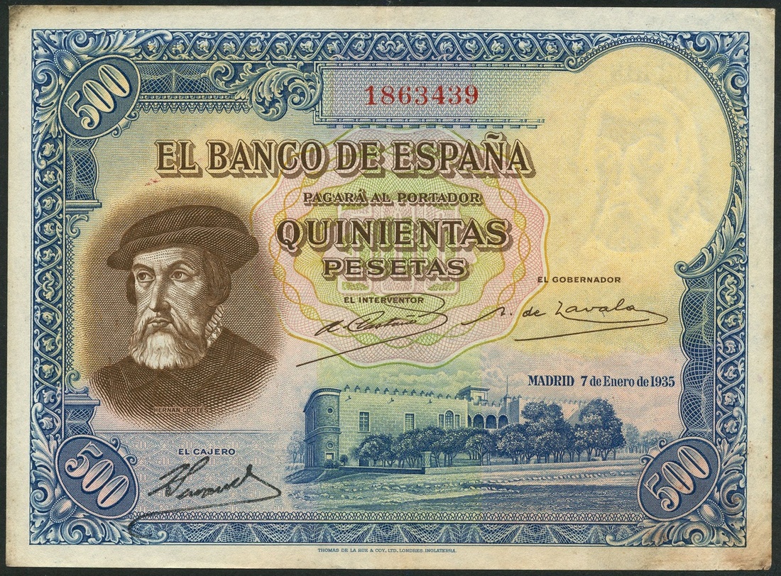 El Banco de Espana, 500 pesetas, 1935, red serial number 1863493, blue and multicoloured, Cortez at left, his Mexican hacienda at low right