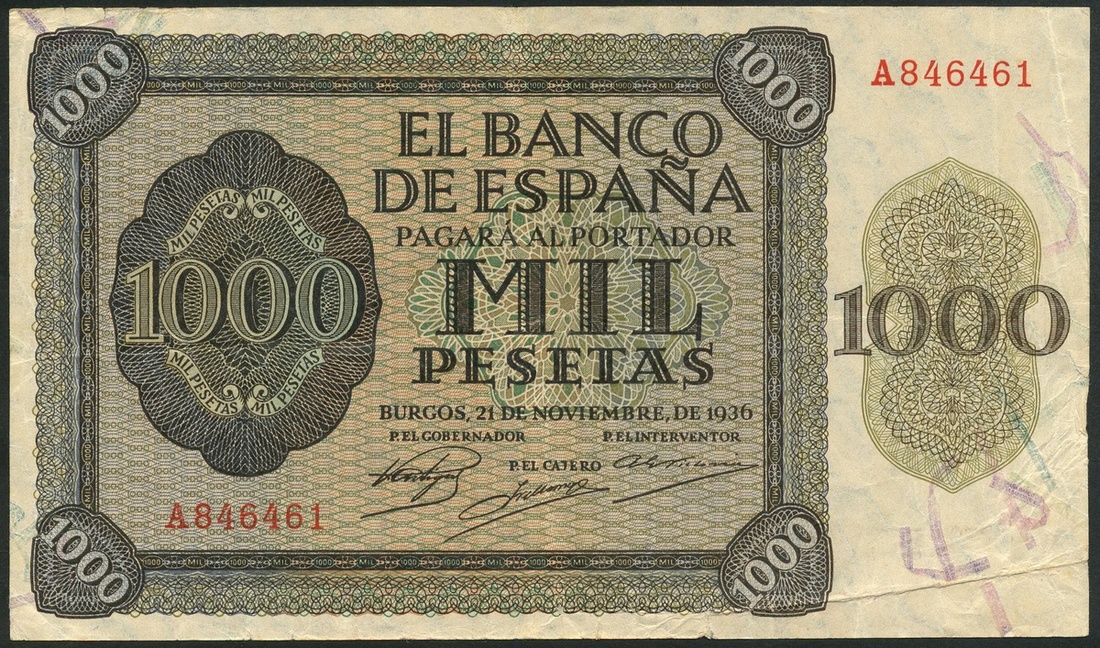 El Banco de Espana, Burgos, 25 pesetas, blue, 50 pesetas, brown, 100 pesetas, green, 500 pesetas, blue and 1000 pesetas, green and brown, all 21 November 1936, red serial numbers