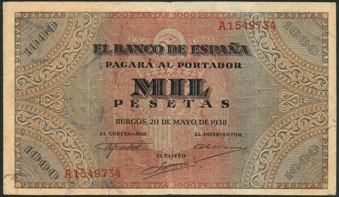 El Banco de Espana, Burgos issues, comprising 5, 25, 50, 100, 500 and 1000 pesetas, 1938 (Pick 110, 111, 112, 113, 114, 115), generally fine, the 500 and 1000 scarce (6)