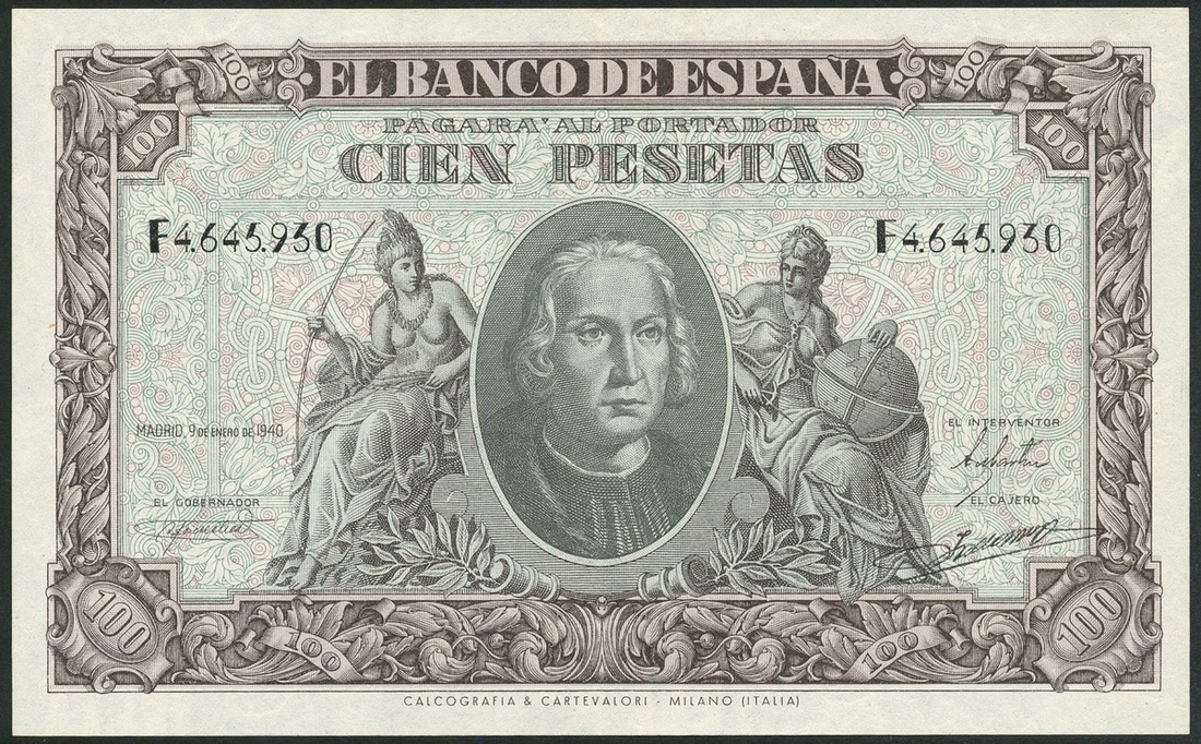 El Banco de Espana, 25 pesetas, blue, de Herrera at left, 50 pesetas, green, Pelayo at left and 100 pesetas, lilac, Columbus at centre, all 9 January 1940