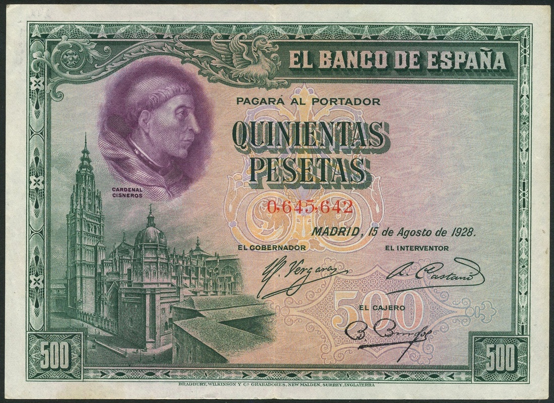 El Banco de Espana, a selection of 500 pesetas, 1927 (2), 1928, 1931, 1940, 1946, 1951, 1954, 1971, 1979, the 500 of 1946, blue, de Vitoria at right, also the 500 of 1951, blue, Benlliure at left