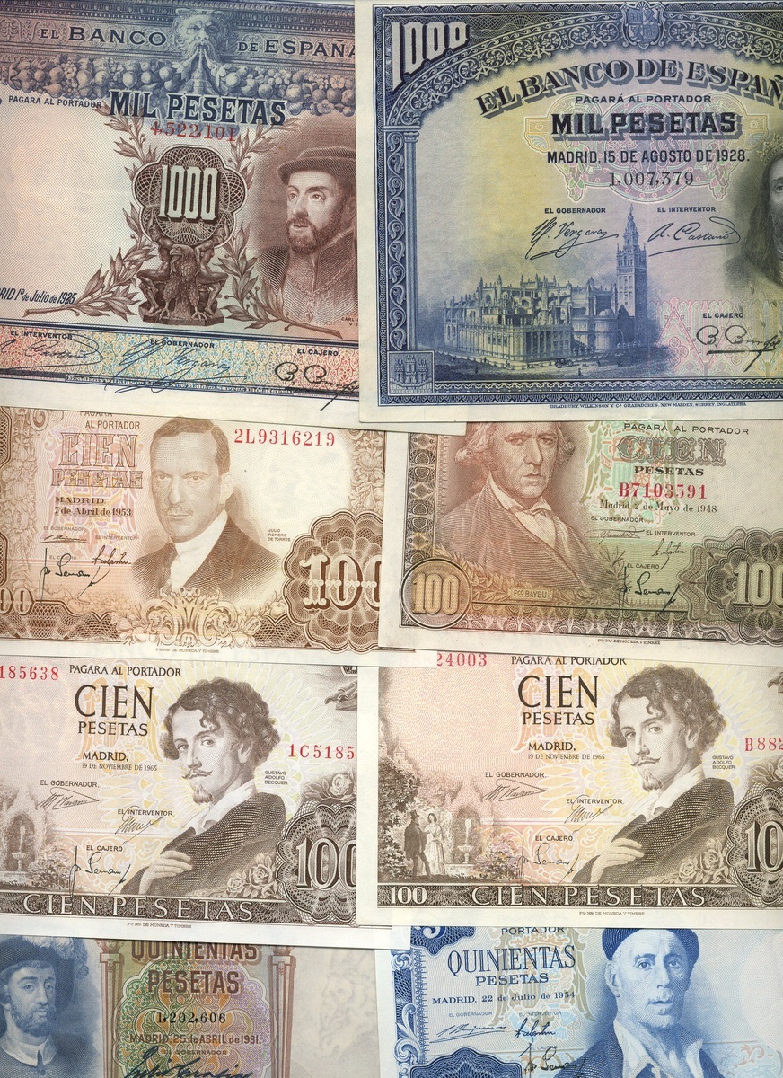 El Banco de Espana, a group comprising 100 pesetas 1948, 100 pesetas , 1953 and 100 pesetas (8), 1965, 500 pesetas (3), 1927, blue, Isabel at right, 500 pesetas (3), 1928, green, Cardinal Cisneros at left, 500 pesetas (5), 1931, 500 pesetas (3), 1954, 500 pesetas (2), 1971, 500 pesetas, 1979 and 1000 pesetas (4), 1925, blue, Carlos I at right, 1000 pesetas (5), 1928, blue, San Fernando at right