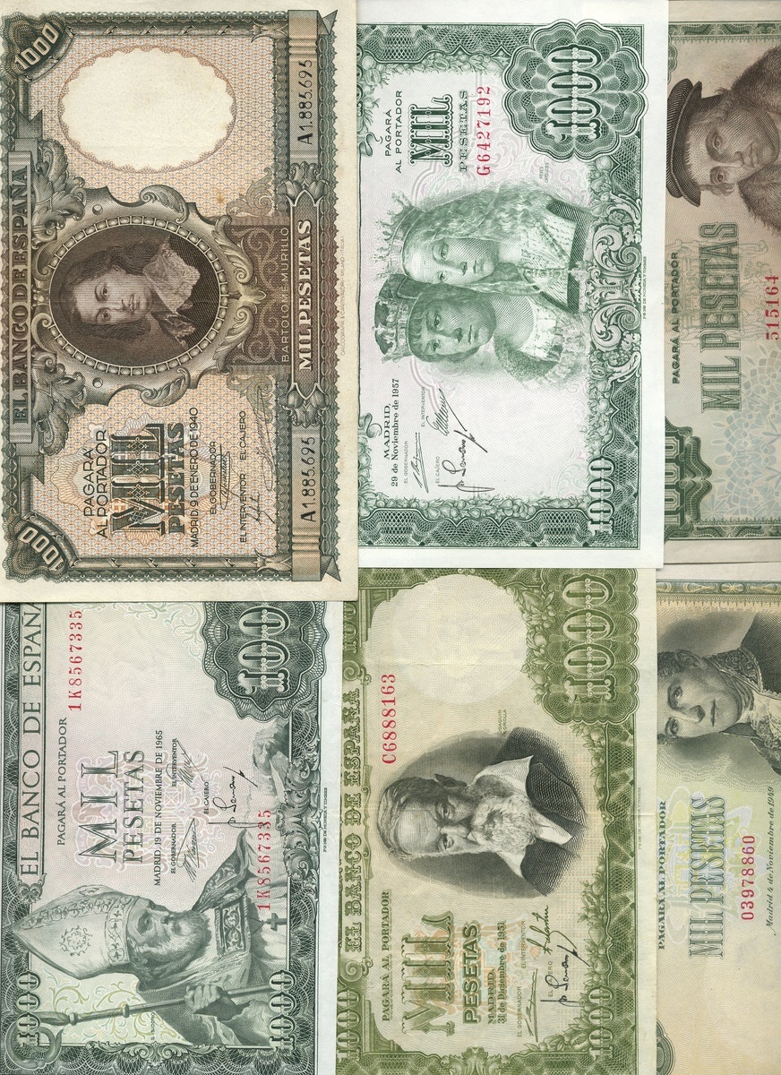 El Banco de Espana, a group of 1000 pesetas comprising 1925, 1928, the Burgos issue of 1936, 1940, brown, Murillo portrait, 1946, 1949, 1951, 1957, 1965