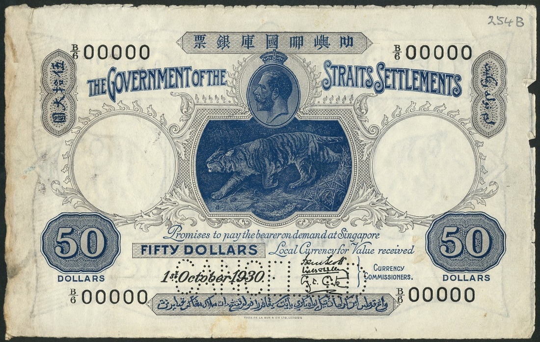(†) Government of the Straits Settlements, specimen $50, 1 October 1930, serial number B/6 00000, blue and white and mauve, crowned head of George V top centre, tiger below, value low left and right, signatures of Scott, Shelley and Cator