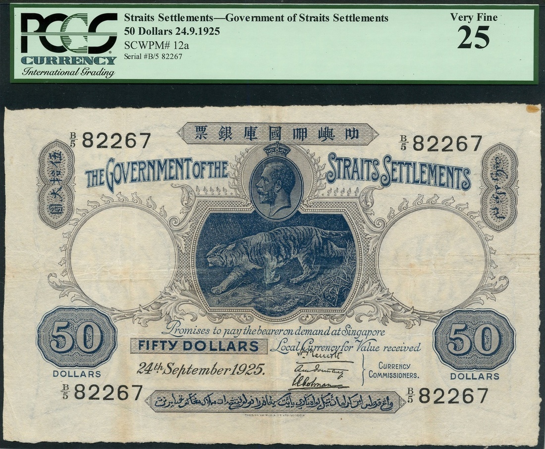 Government of the Straits Settlements, $50, 24 September 1925, serial number B/5 82267, blue, mauve and white, crowned head of George V at top centre above tiger, value at centre and at each corner, signatures of Marriott, Pountney and Colman