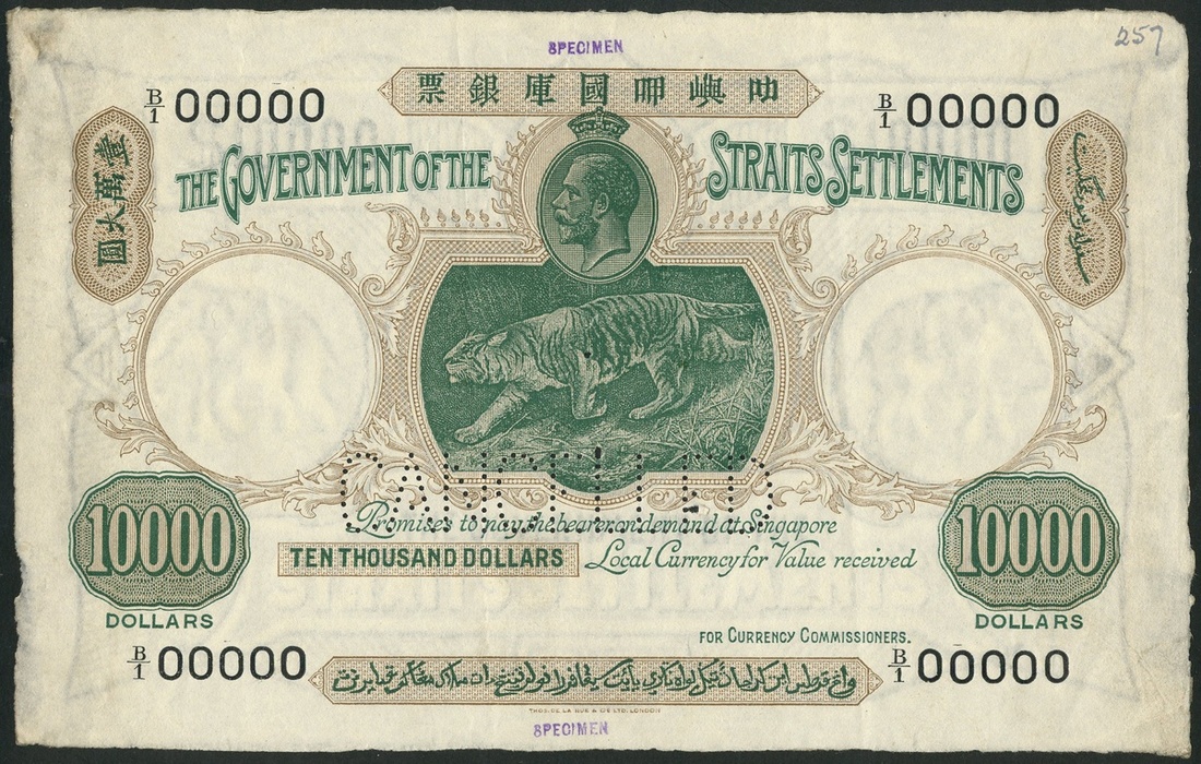 (†) Government of the Straits Settlements, specimen $10000, ND (type of 1919), serial number B/1 00000, pale brown and green on white paper, crowned head of George V top centre, tiger below, value low left and right, signatures omitted