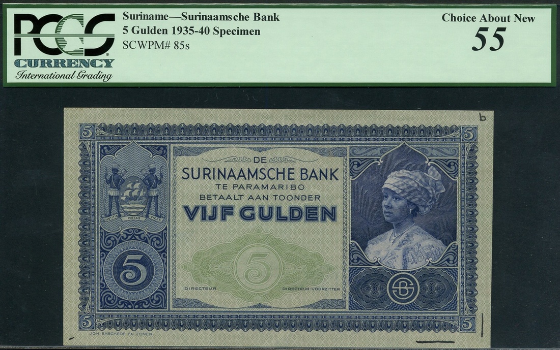 De Surinaamsche Bank, proof 5 gulden, ND (1935-40), no serial number, blue on light green underprint, native girl in headscarf at right, arms at top left