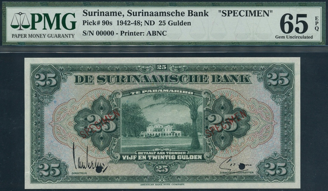 De Surinaamsche Bank, specimen 25 gulden, 1 February 1942, zero serial numbers, green on multicolour underprint, government palace at centre, value at left, right and corners, reverse green, arms at low centre, two cancellation holes and red SPECIMEN overprint