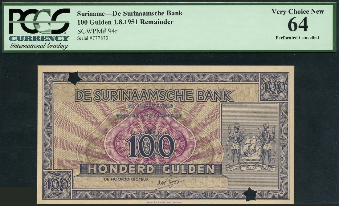 De Surinaamsche Bank, remainder 100 gulden, 1 August 1951, serial number HD 777873, purple on multicolour underprint, arms at right, value at centre, low left and top right, reverse purple and blue, two star shaped cancellation holes