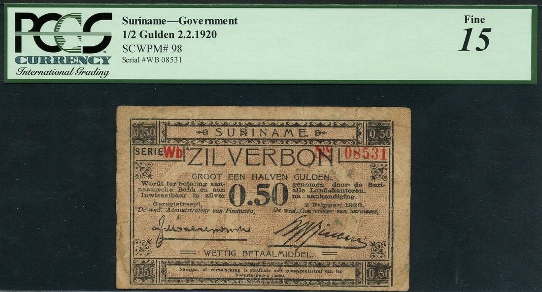 Suriname Zilverbon, 0.50 gulden, 2 February 1920, serial number Wb 08531, uniface, brown, value at centre and corners