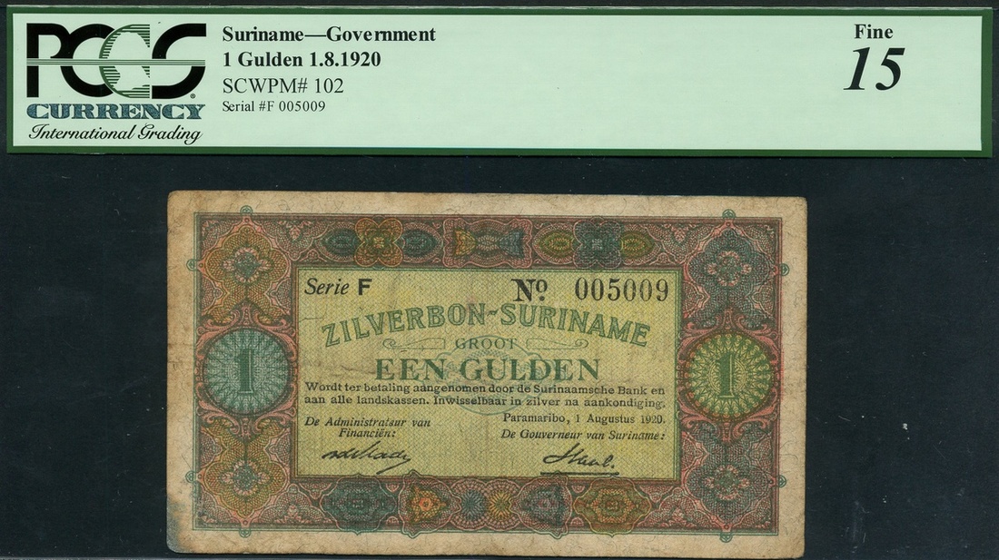 Suriname Zilverbon, 1 gulden, 1 August 1920, serial number F 005009,, red, orange, green and yellow, value at left and upper and lower right, reverse red